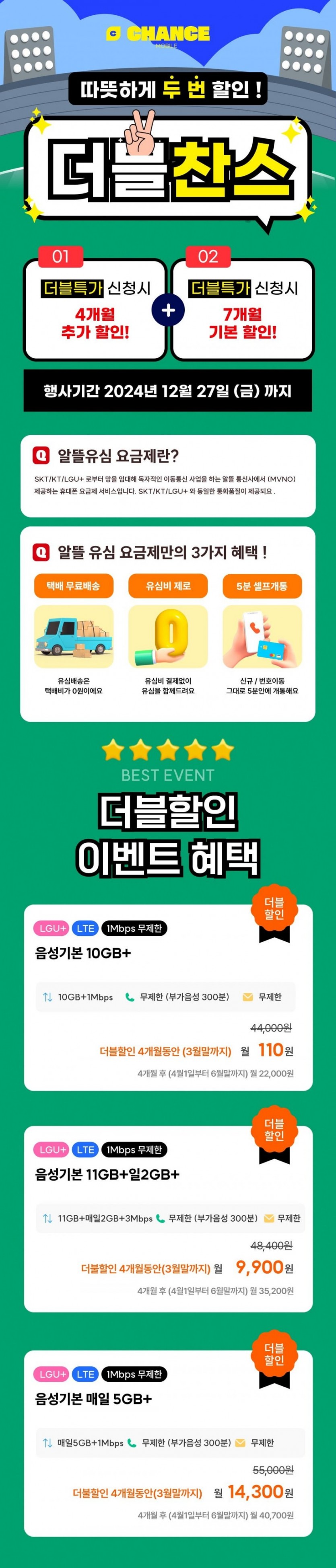 찬스모바일 초특가 작성자 정보 관리자 작성 작성일 2024.12.23 19:53 컨텐츠 정보 2,006 조회 0 추천 0 비추천 목록 본문 찬스모바일쉽고 빠른 개통, 통신비 절감의 찬스!https://chancemobile.co.kr/view/distributor/phone_plan_distributor.aspx?poscd=bcd188635790aefcd14ba77b3f85b1c0 알뜰폰 10GB+1MPS 3월30일까지 100원알뜰폰 11G+2GB+3MBPS 3월30일까지 9900원 . 100기가+5mps . 14000원 . 3월까지쓰고 4월에 번호이동 하심 될거 같네요.그리고 테더링 필요하신분은 엘지 특성상 E심 섞어서 하는 것도 추천 드립니다. E심 개통도 가능하다고합니다.#viral#fyp#tiktok#comedy 0 추천 0 비추천 SNS 공유 관련자료 링크 https://chancemobile.co.kr/view/distributor/phone_plan_distributor.aspx?poscd=bcd188635790aefcd14ba77b3f85b1c0 820 회 연결 이전 리쏘 영원씨 안마의자 작성일 2025.02.08 21:35 다음 “나야, 흑백요리사” 출연진들의 식당 리스트 총정리! 작성일 2024.10.11 16:23 댓글 0 등록된 댓글이 없습니다. 로그인한 회원만 댓글 등록이 가능합니다. 목록