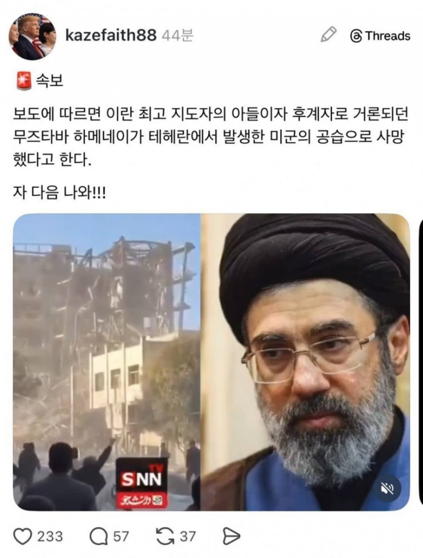 (속보) 하메네이 아들 사망 작성자 정보 81b20880 작성 작성일 2026.03.04 21:14 컨텐츠 정보 344 조회 0 추천 0 비추천 목록 본문 사망.. 0 추천 0 비추천 SNS 공유 관련자료 이전 BTS 공연 앞두고 갤럭시 대여 증가 작성일 2026.03.20 21:58 다음 속보) 이란 미친 사우디 아람코 시설 공격 ㄷㄷㄷ 작성일 2026.03.02 17:37 댓글 0 등록된 댓글이 없습니다. 로그인한 회원만 댓글 등록이 가능합니다. 목록