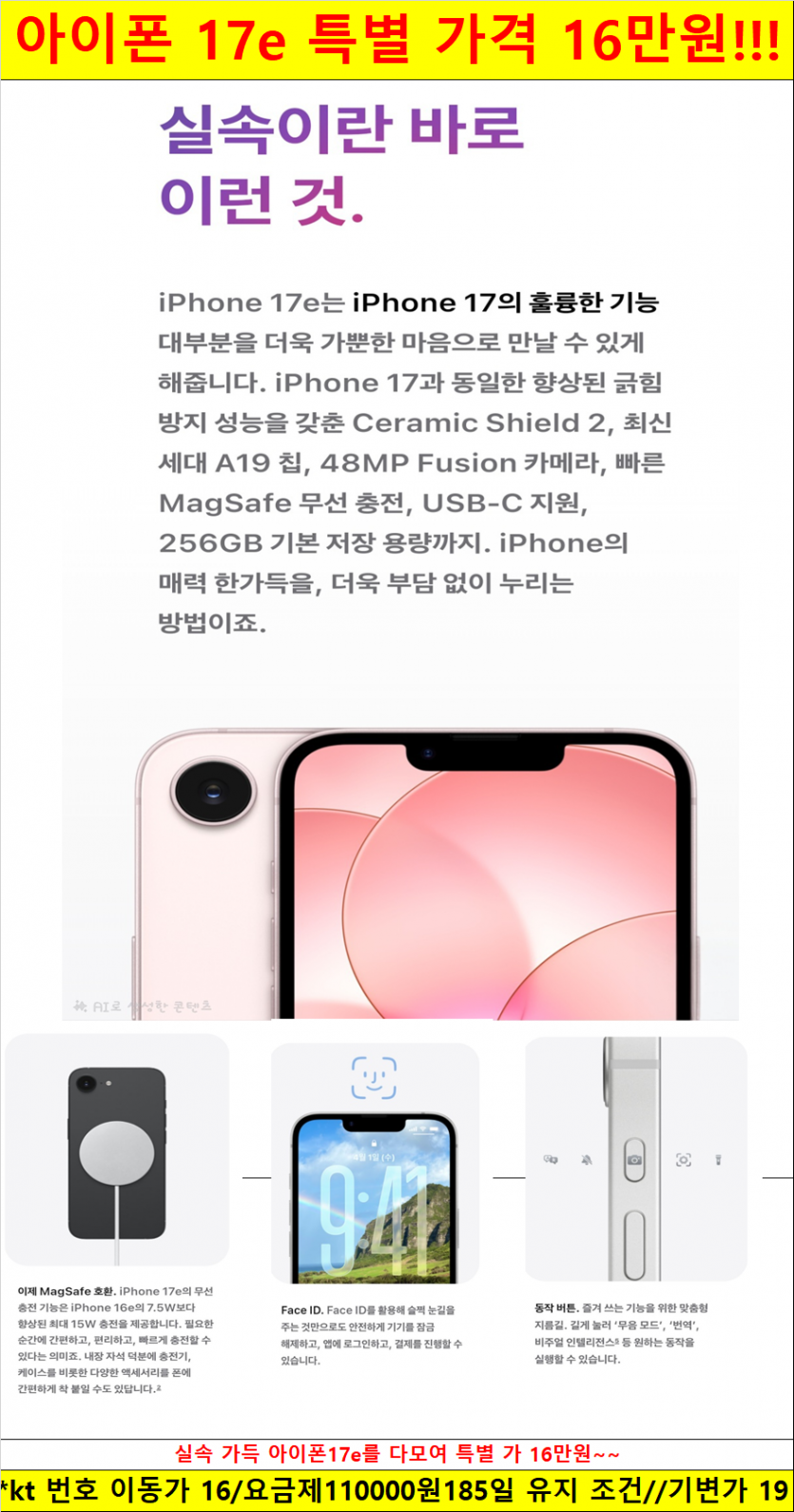 모바일/상품권 분류 아이폰17e SNS 공유 작성자 정보 물어보세요 쪽지보내기 메일보내기 자기소개 아이디로 검색 전체게시물 쪽지보내기 메일보내기 자기소개 아이디로 검색 전체게시물 작성 작성일 2026.03.26 12:47 컨텐츠 정보 141 조회 0 추천 0 비추천 목록 관련자료 쇼핑몰 tlsehfla 상품명 아이폰17e 가격 16원 배송 문의 본문 아이폰 17e 특별가~~~~문의 주세요카톡ID:moyeo82 0 추천 0 비추천 SNS 공유 관련자료 이전 핀다이렉트SK망 4개월 5900원 100기가+5mpbs 작성일 2026.04.03 20:56 다음 헬로모바일 코드입력시 10만원 추가증정! 3월17일~23일 단 7일간만 진행 작성일 2026.03.17 11:44 댓글 0 등록된 댓글이 없습니다. 로그인한 회원만 댓글 등록이 가능합니다. 목록