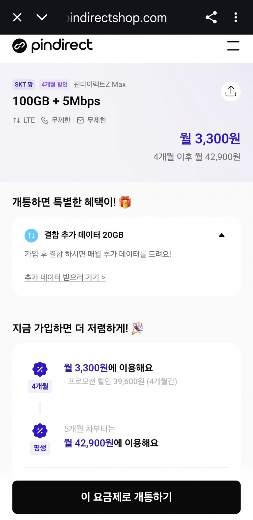 100기가+5mps +20기가 추가 총 120기가+5mps 3300원